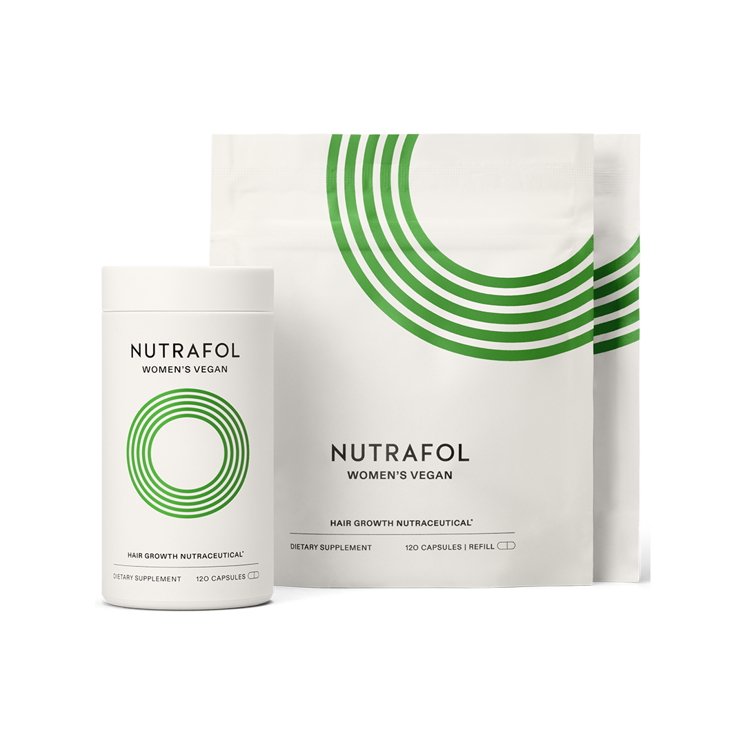 Nutrafol Women’s Vegan is clinically shown to improve hair growth and lessen visible shedding while promoting faster-growing, longer, and stronger hair. It’s also been shown to promote visibly thicker lashes and brows, reduce feelings of stress, and improve feelings of increased energy.