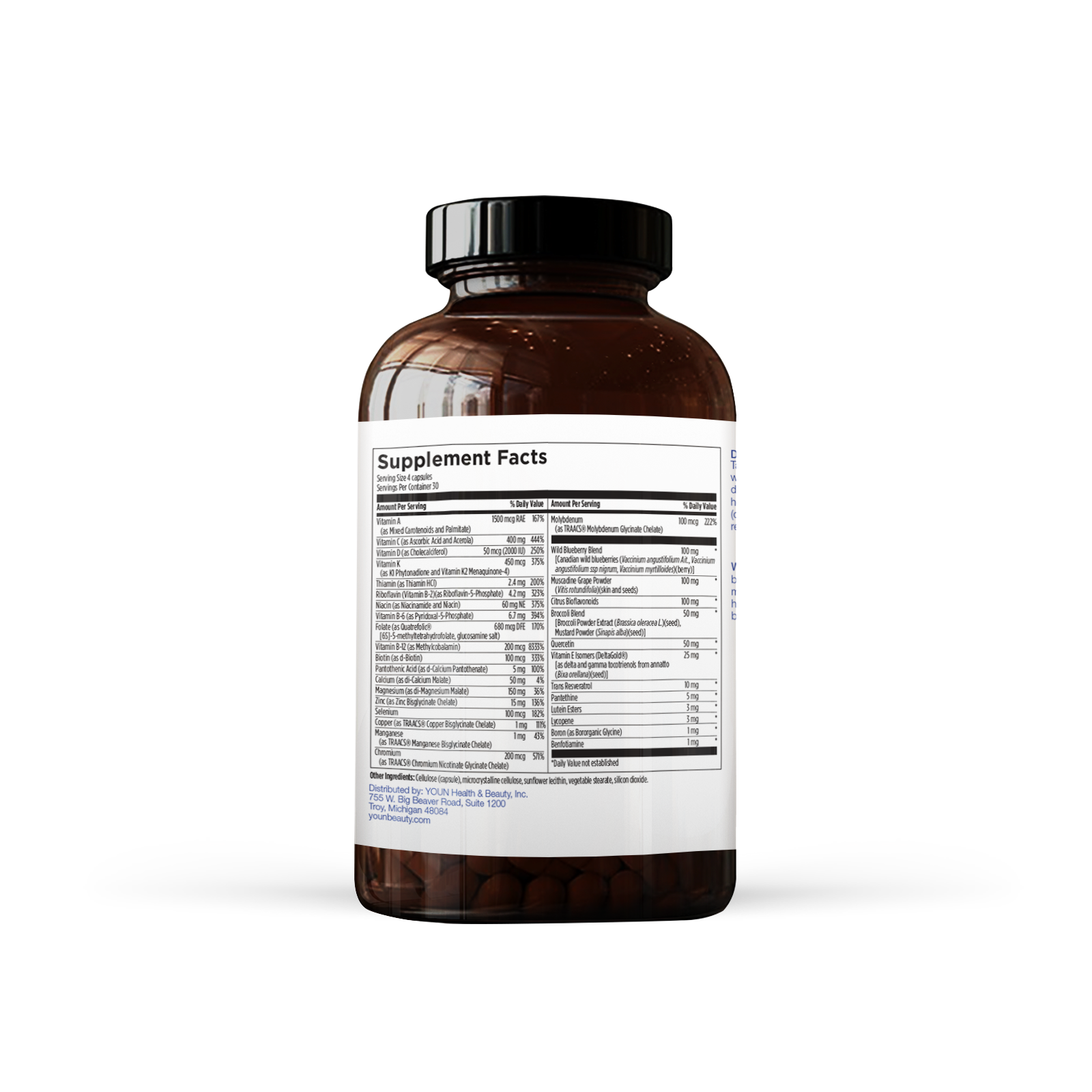 Collagen forms the building blocks of your skin. The blend of vitamins and nutrients in YOUN Beauty Skin and Hair Support is specially formulated to support the collagen of your hair, skin, and nails and may be used as a substitute for a daily multivitamin. It contains vitamin C, an antioxidant and an integral ingredient in creating collagen, and vitamin A, which supports the immune function and promotes healthy collagen. The trace minerals copper and zinc assist in the production of collagen. This supplement also contains such skin-healthy nutrients as niacinamide, vitamin D, biotin, and green tea extract. Chock full of healthy ingredients, it also contains the powerful antioxidants resveratrol and quercetin, along with wild blueberry and broccoli blends.
